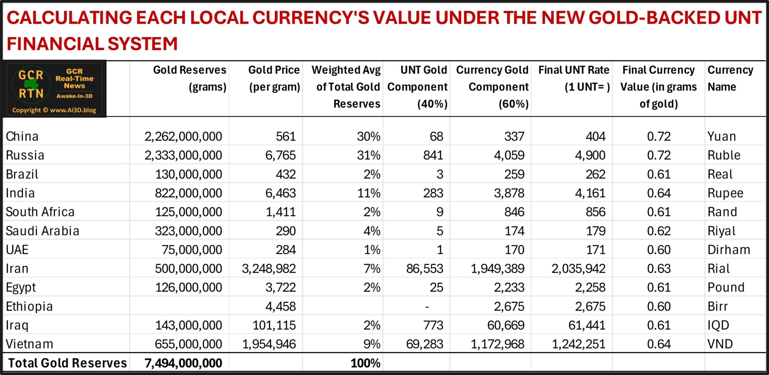 The UNT formula is composed of 40% gold and 60% currency basket. There are assumptions regarding the number and composition of the currencies in this basket. The global currency reset (GCR) aims to be gold-backed, seeking to achieve increased transparency and valuation based on each participating nation’s gold holdings.