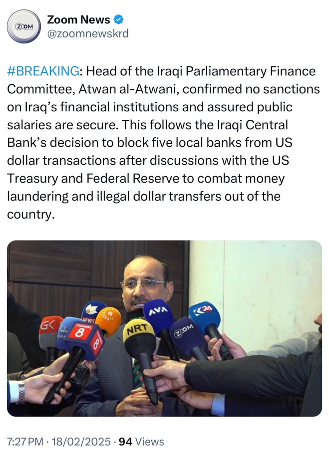 #BREAKING: Head of the Iraqi Parliamentary Finance Committee, Atwan al-Atwani, confirmed no sanctions on Iraq’s financial institutions and assured public salaries are secure. This follows the Iraqi Central Bank’s decision to block five local banks from US dollar transactions